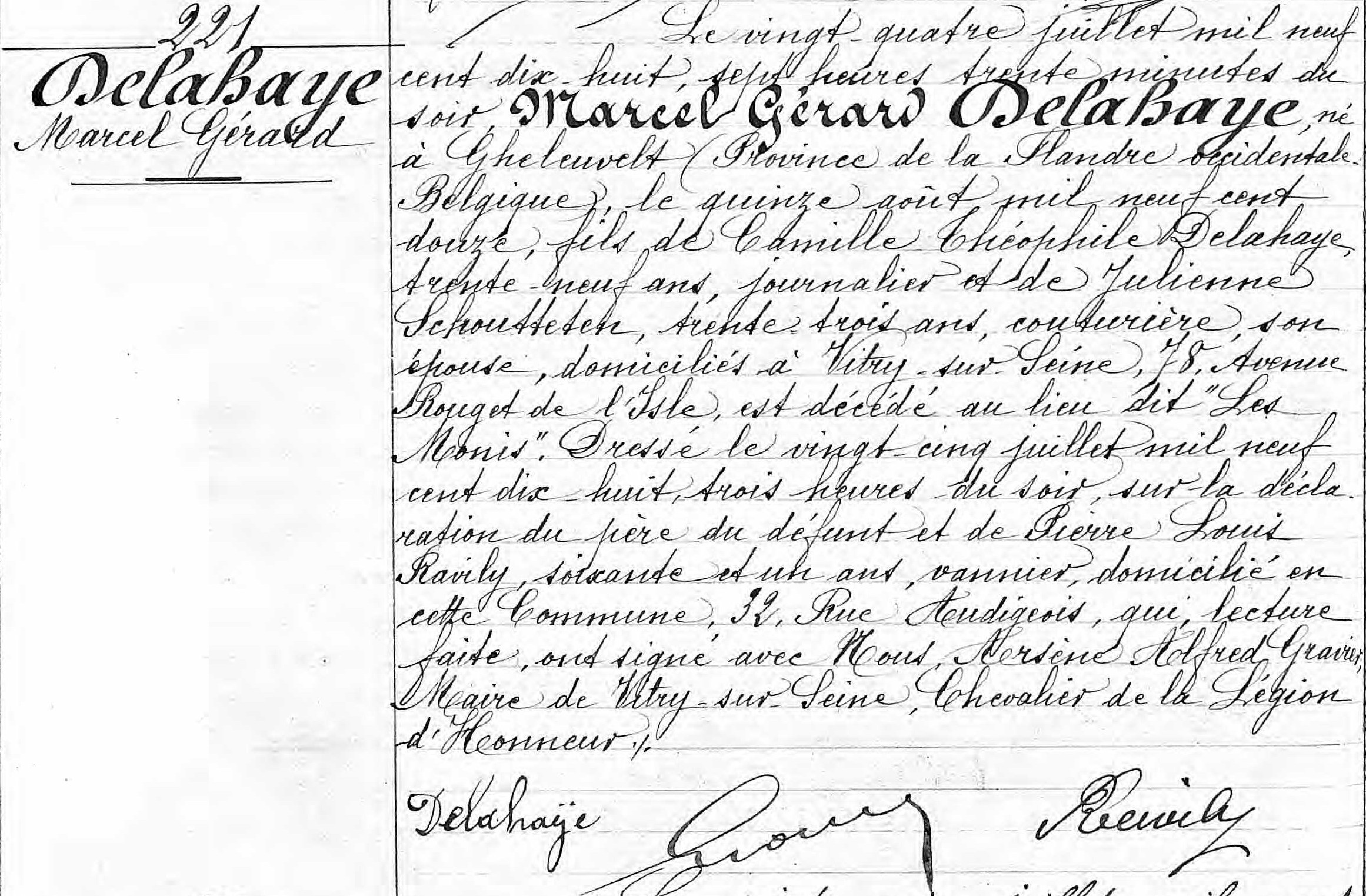 Zoon Delahaye Marcel Maurice is tijdens het verblijf in Frankrijk overleden op 24/07/1918 in Vitry-sur-Seine