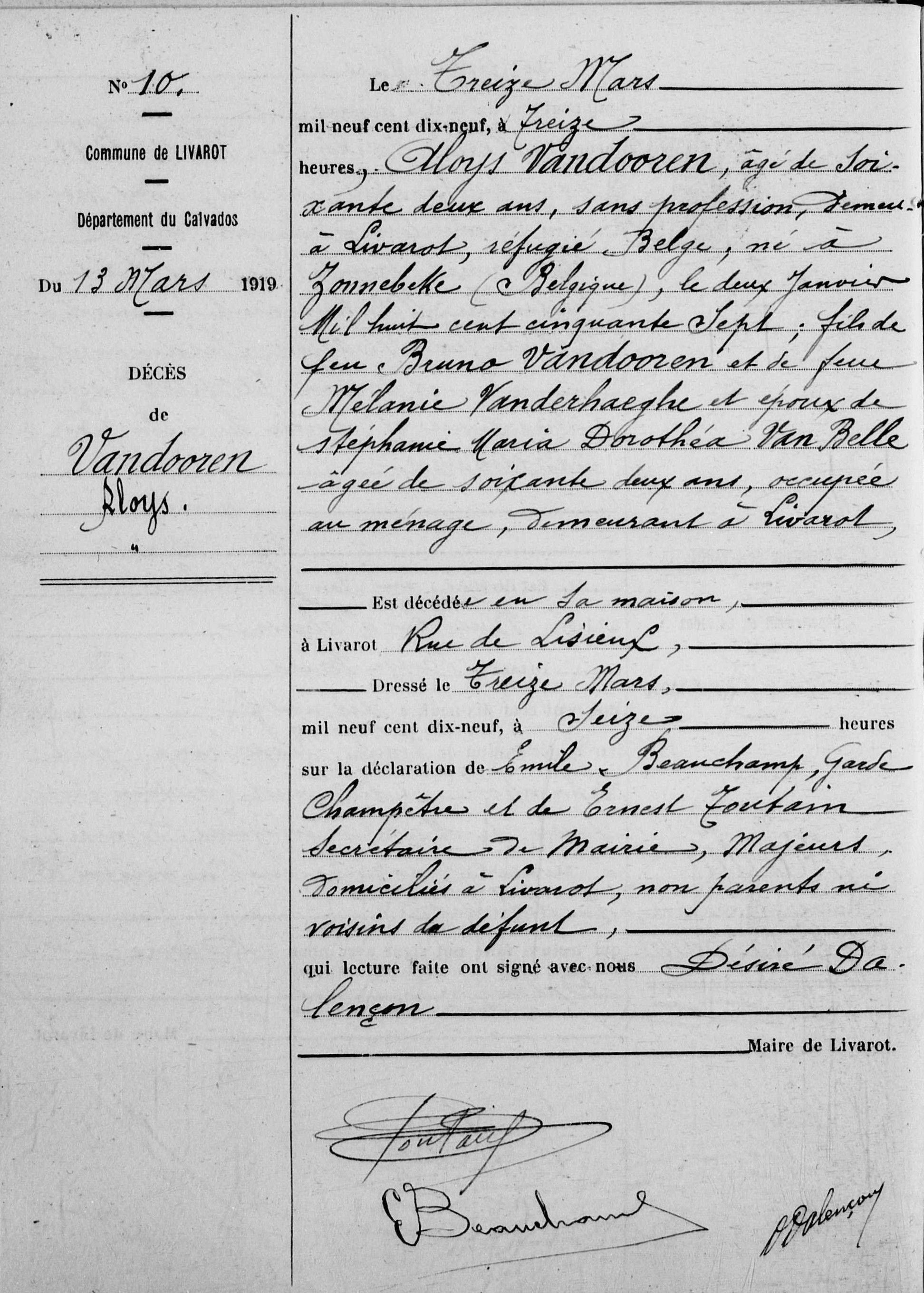 Vandooren Aloisius is tijdens het verblijf in Frankrijk overleden op 13/03/1919 in Livarot