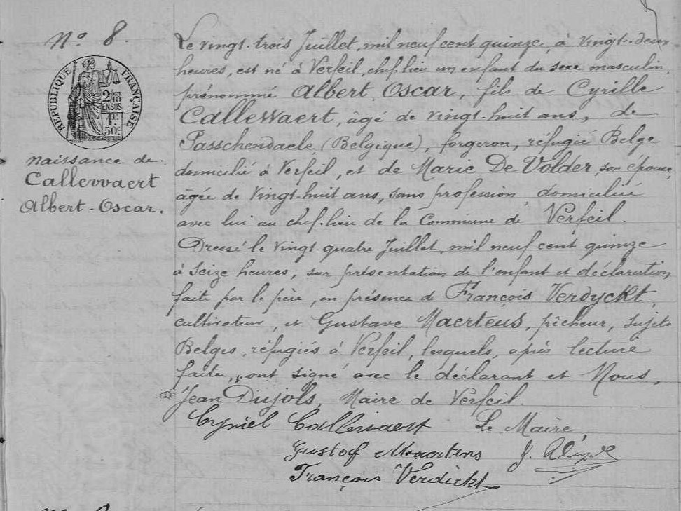 Cyriel Camiel Callewaert en Maria Elisa Devolder verbleven zij van halfweg 1915 in Verfeil-sur-Seye (Tarn-et-Garonne) met hun kinderen Zenobie Marie (°1908), Georgina Marie (°1911), Martha Marie (°1913) en Urbain Jozef (°1914). Daar werd hun kind Albert Oscar geboren op 23 juli 1915 en Jules op 24 september 1918. In 1920 verbleven zij in Albi (Tarn) waar op 24 november 1920 hun dochter Suzanne werd geboren.