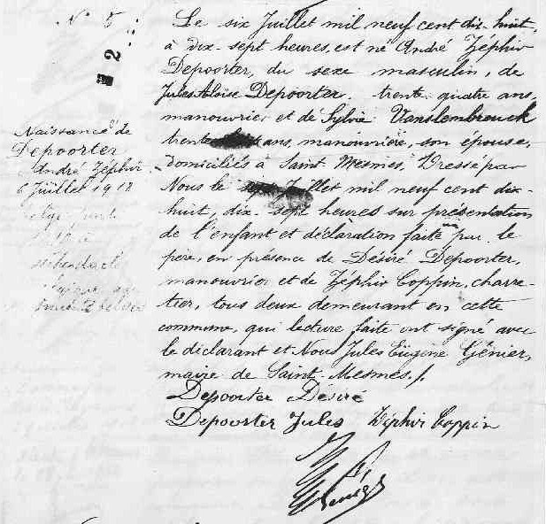 Zoon Depoorter André Zephir werd tijdens hun verblijf in Frankrijk geboren op 06/07/1918 in Saint-Mesmes