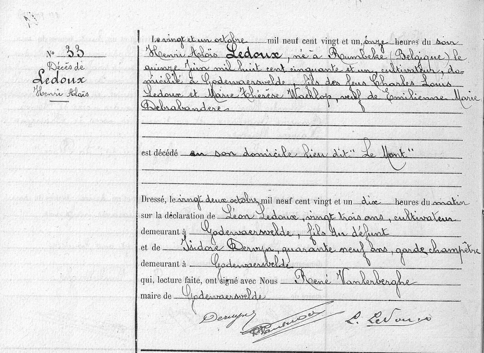 Ledoux Henricus Aloysius is tijdens het verblijf in Frankrijk overleden op 21/10/1921 in Godewaersvelde
