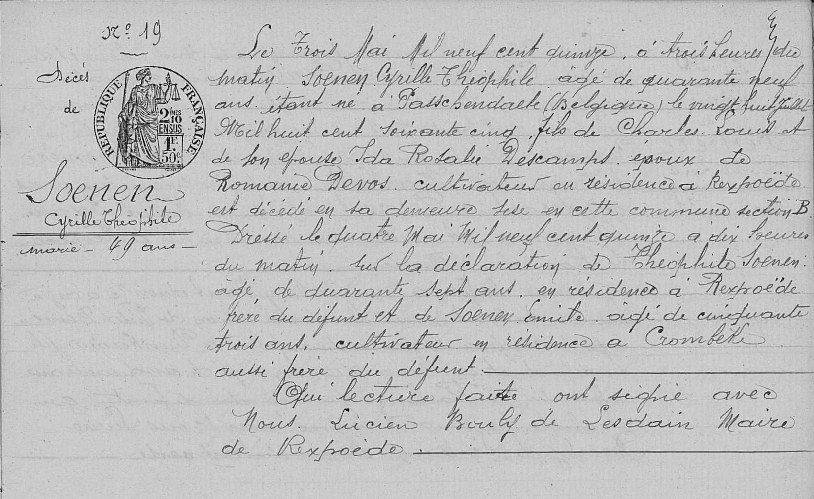 Soenen Cyrillus Theophilus is tijdens het verblijf in Frankrijk overleden op 03/05/1915 in Rexpoëde