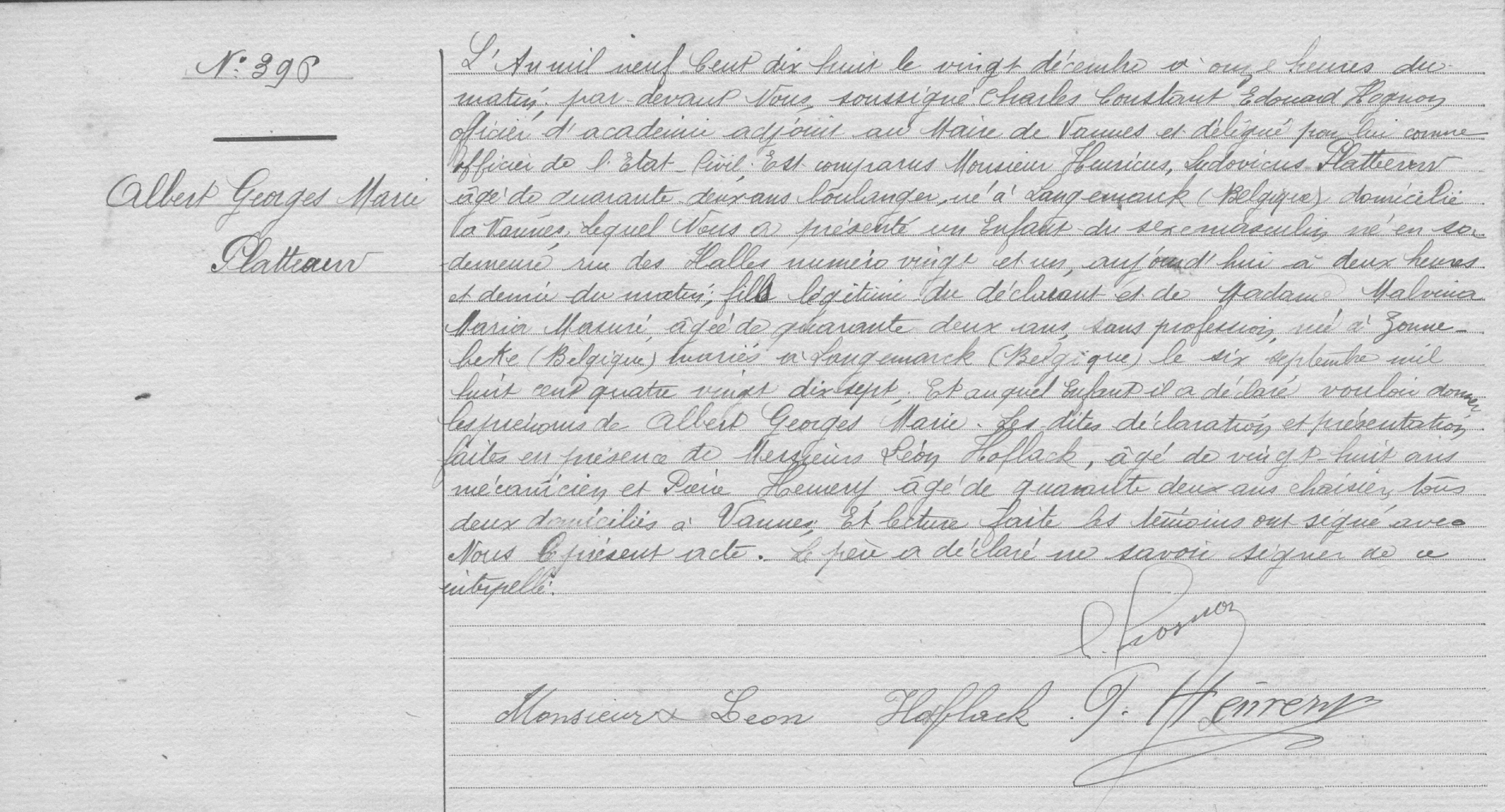 Zoon Platteeuw Albert Georges Marie werd tijdens hun verblijf in Frankrijk geboren op 20/12/1918 in Vannes (Bretagne)