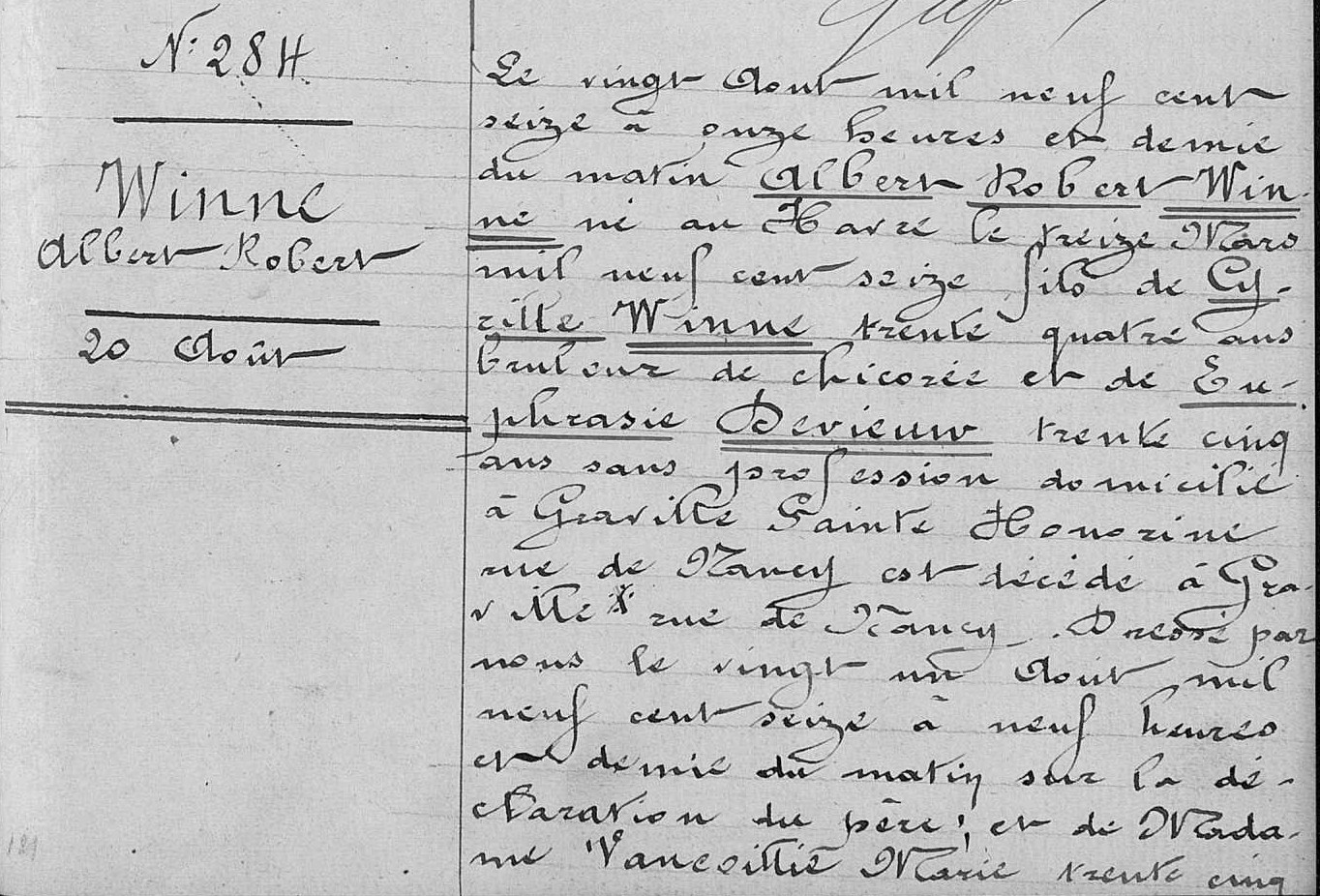 Winne Albert Robert is tijdens het verblijf in Frankrijk overleden op 20/08/1916 in Graville-Saint-Honorine