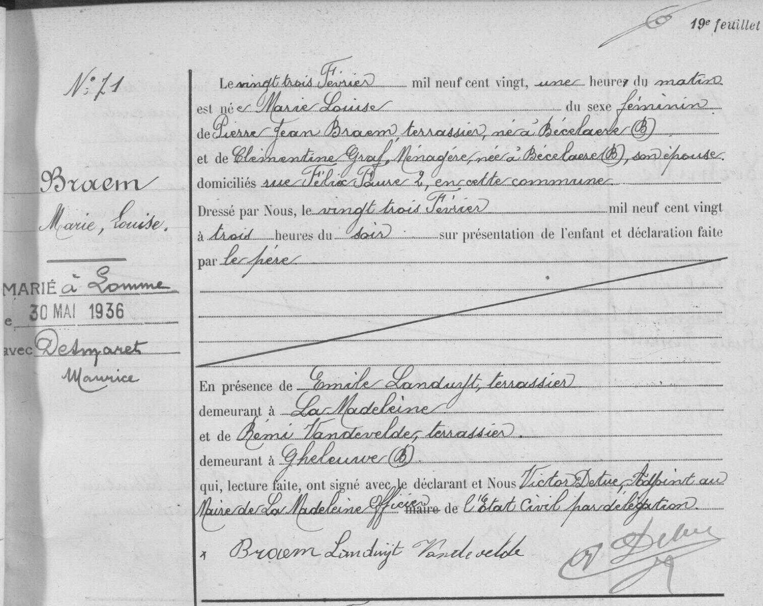Dochter Braem Marie Louise werd tijdens hun verblijf in Frankrijk geboren op 23/02/1920 in La Madeleine