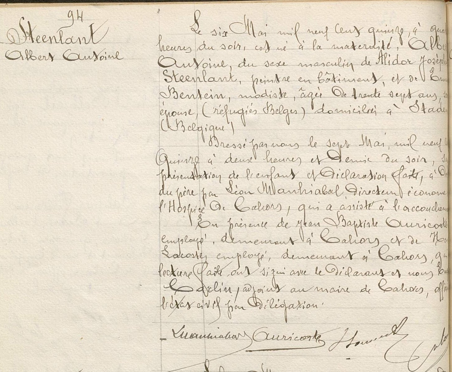 Zoon Steenlant Albert Antoine werd tijdens hun verblijf in Frankrijk geboren op 06/05/1915 in Cahors