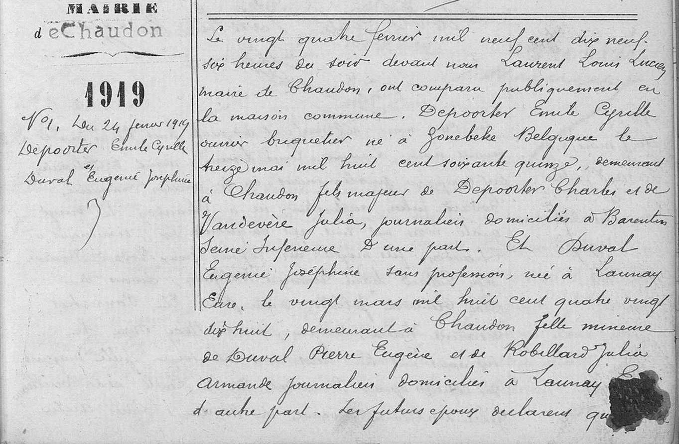 Depoorter Emile Cyrille huwt tijdens het verblijf in Frankrijk met Duval Eugénie Joséphine - (° Launay (Eure) 20/03/1898) op 24/02/1919 in Chaudon