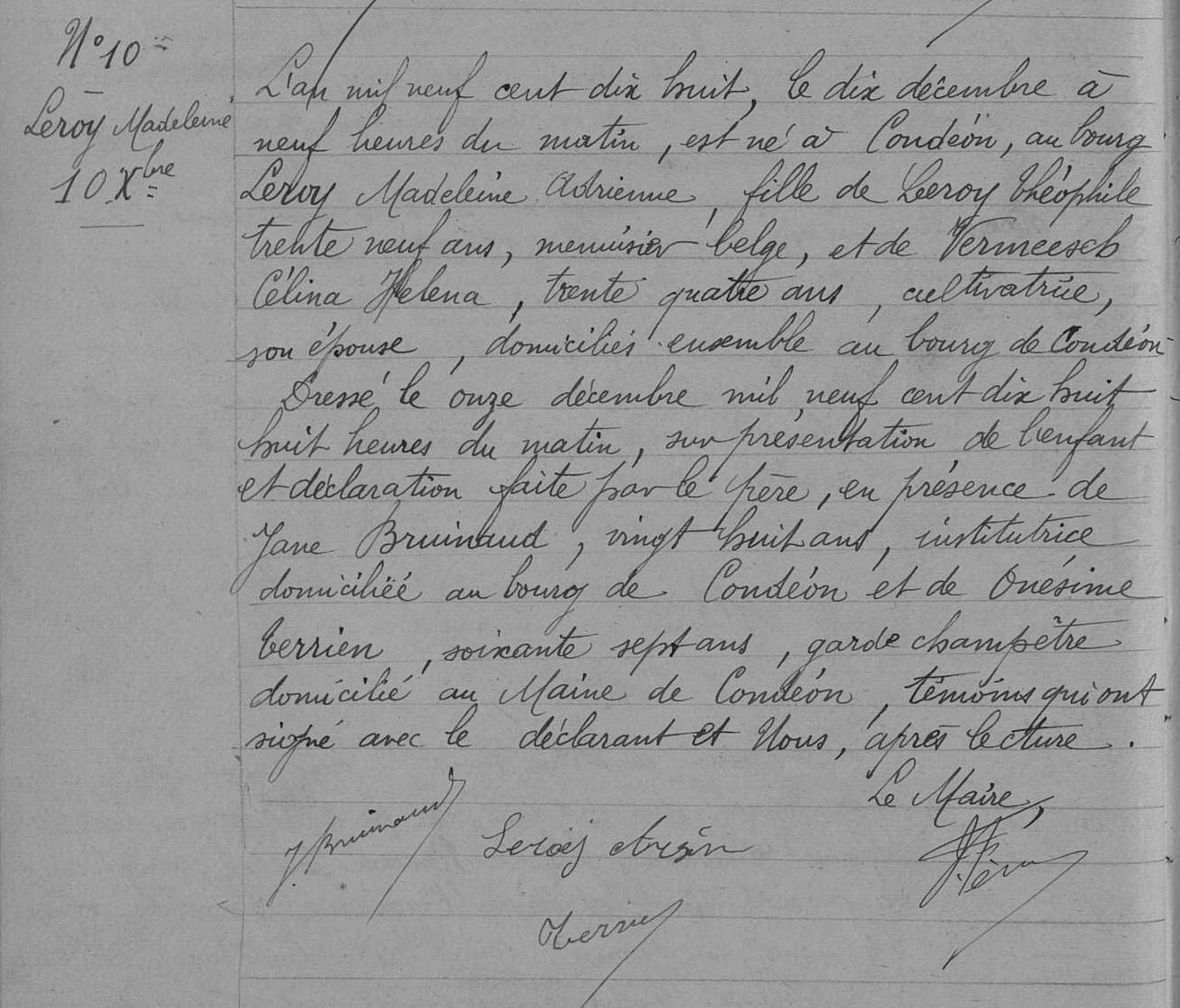 Dochter Leroy Madeleine werd tijdens hun verblijf in Frankrijk geboren op 10/12/1918 in Condèon