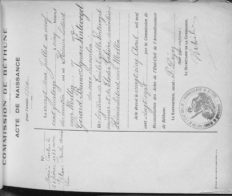 Zoon Vintevogel Gerard Bruno Ignace werd tijdens hun verblijf in Frankrijk geboren op 22/07/1914 in Hénin-Lietard