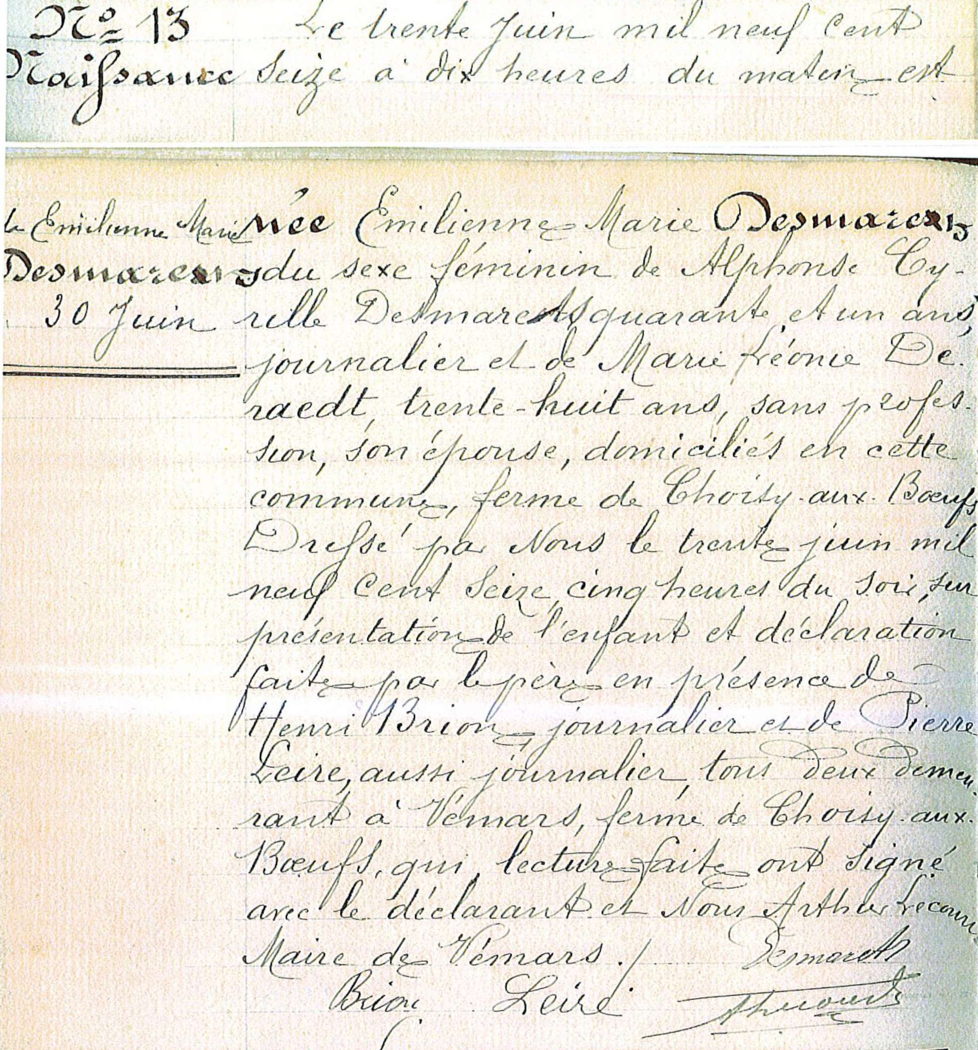 Dochter Desmarets Emilienne Marie werd tijdens hun verblijf in Frankrijk geboren op 30/06/1916 in Vémars