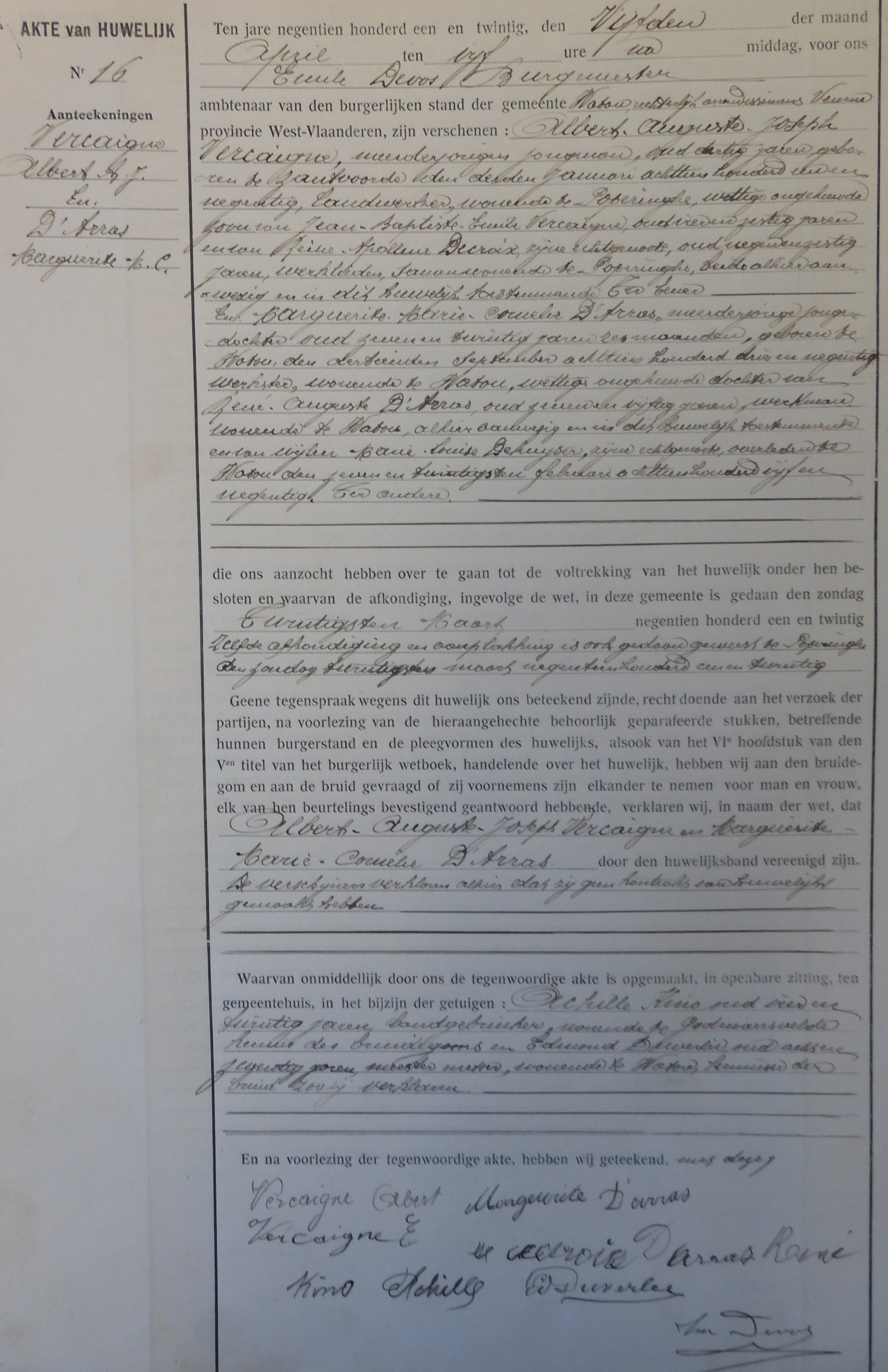 Vercaigne Albert August huwde op 05/04/1921 in Watou met D'Arras Marguerite Maria