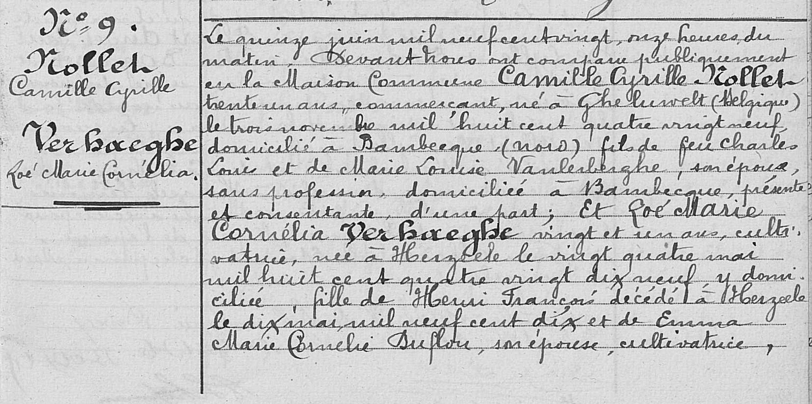 Nollet Camille Cyrille huwt Verhaeghe Zoë Marie Cornelia (°Herzeele 24/05/1899) op 15/06/1920 in Herzeele