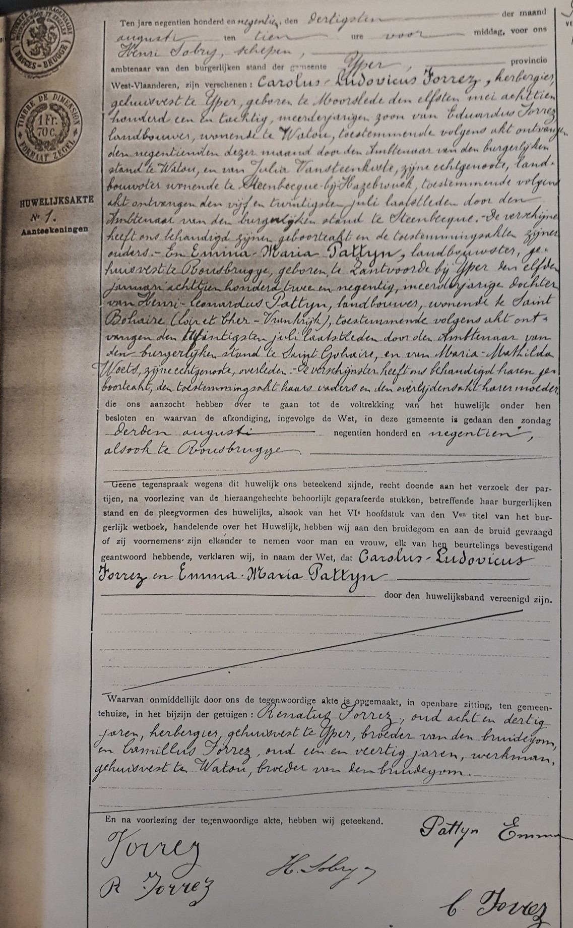 Pattyn Emma huwt tijdens het verblijf in Frankrijk met Forrez Carolus Ludovicus (° Moorslede 11/05/1881) op 30/08/1919 in Ieper