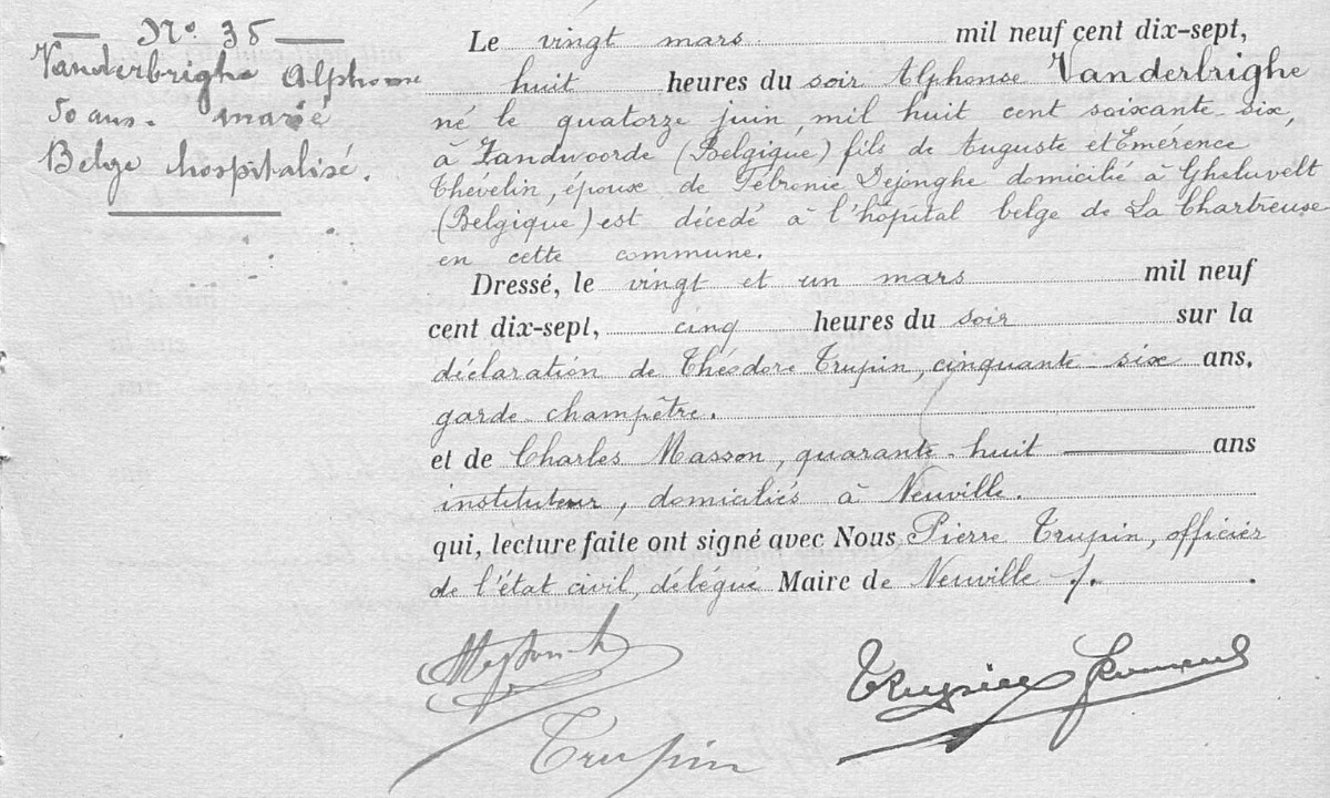 Vanderbrigghe Alphonse Urbain is tijdens het verblijf in Frankrijk overleden op 20/03/1917 in Neuville-sous-Montreuil, hij overleed in het hospitaal La Chartreuse -
