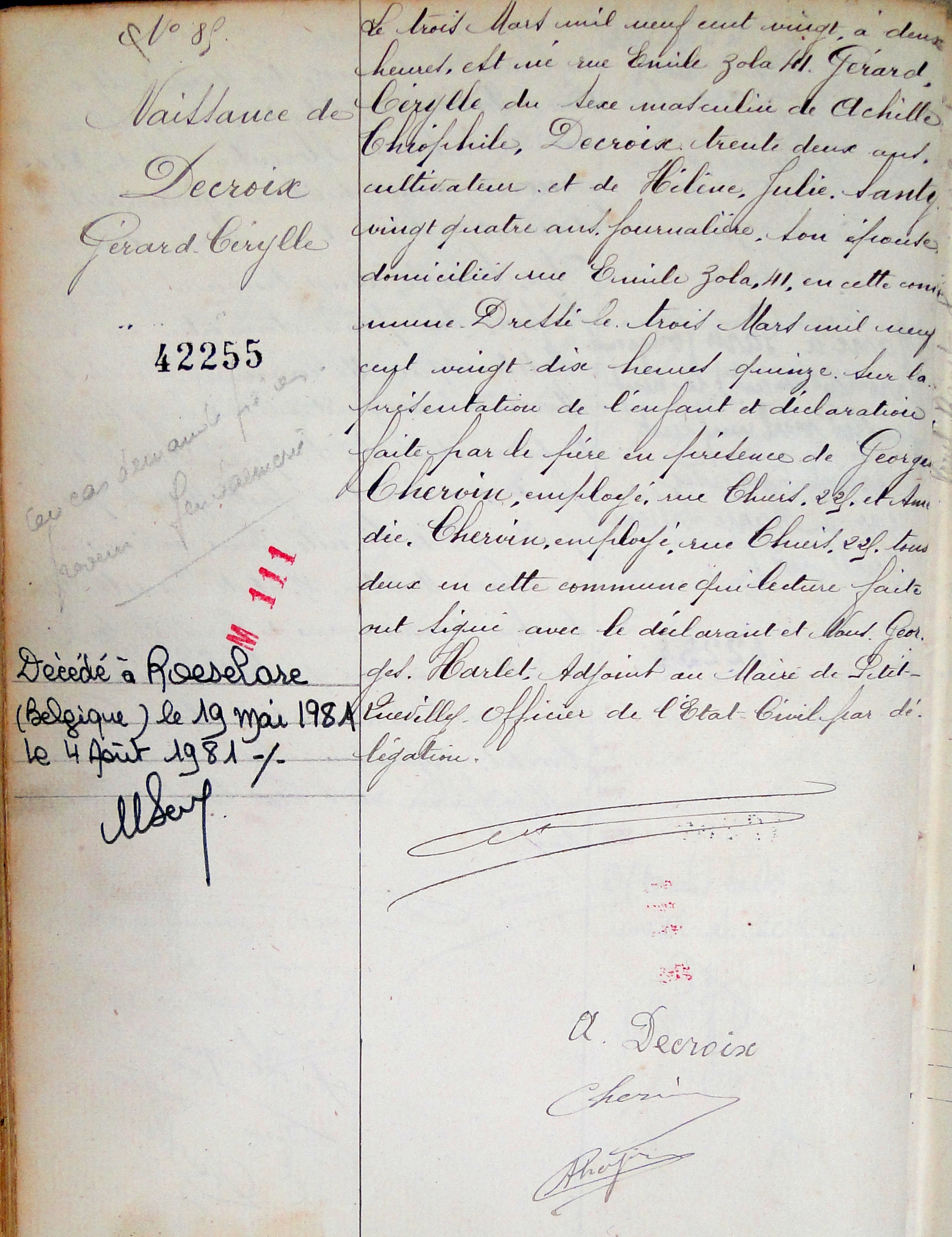 ↑ Geboorteakte van Decroix Gerard Cyrille ↑