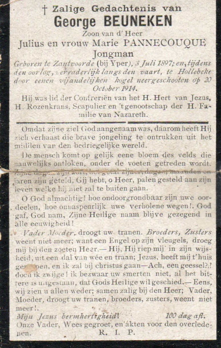Het landbouwersgezin Julien François Beuneken en echtgenote Marie Pannecoucque woonde aan de Champreulle in Zandvoorde en vluchtte in oktober 1914 met hun kinderen via Hollebeke richting Ieper. Ter hoogte van de vaart Ieper - Komen in Hollebeke werd hun zoon Georges Joseph Beuneken (°1897) op 20 oktober 1914 dodelijk getroffen door een kogel. Het gezin verbleef in 1919 in Magny-la-Campagne (Calvados) waar hun dochter Mathilde Pharailde huwde met Jules Henri Louis Parret (ZA0347) op 31 december 1919.