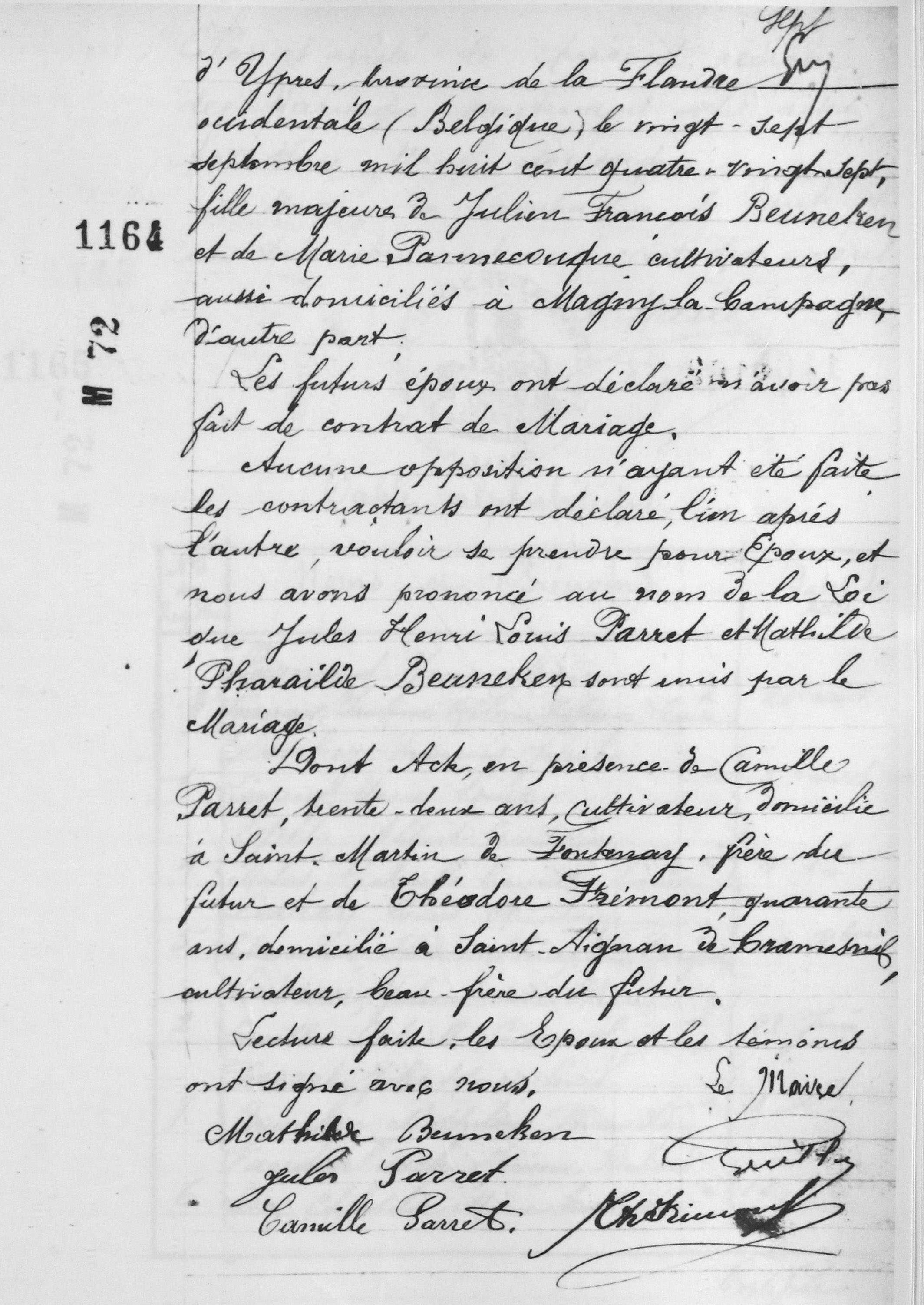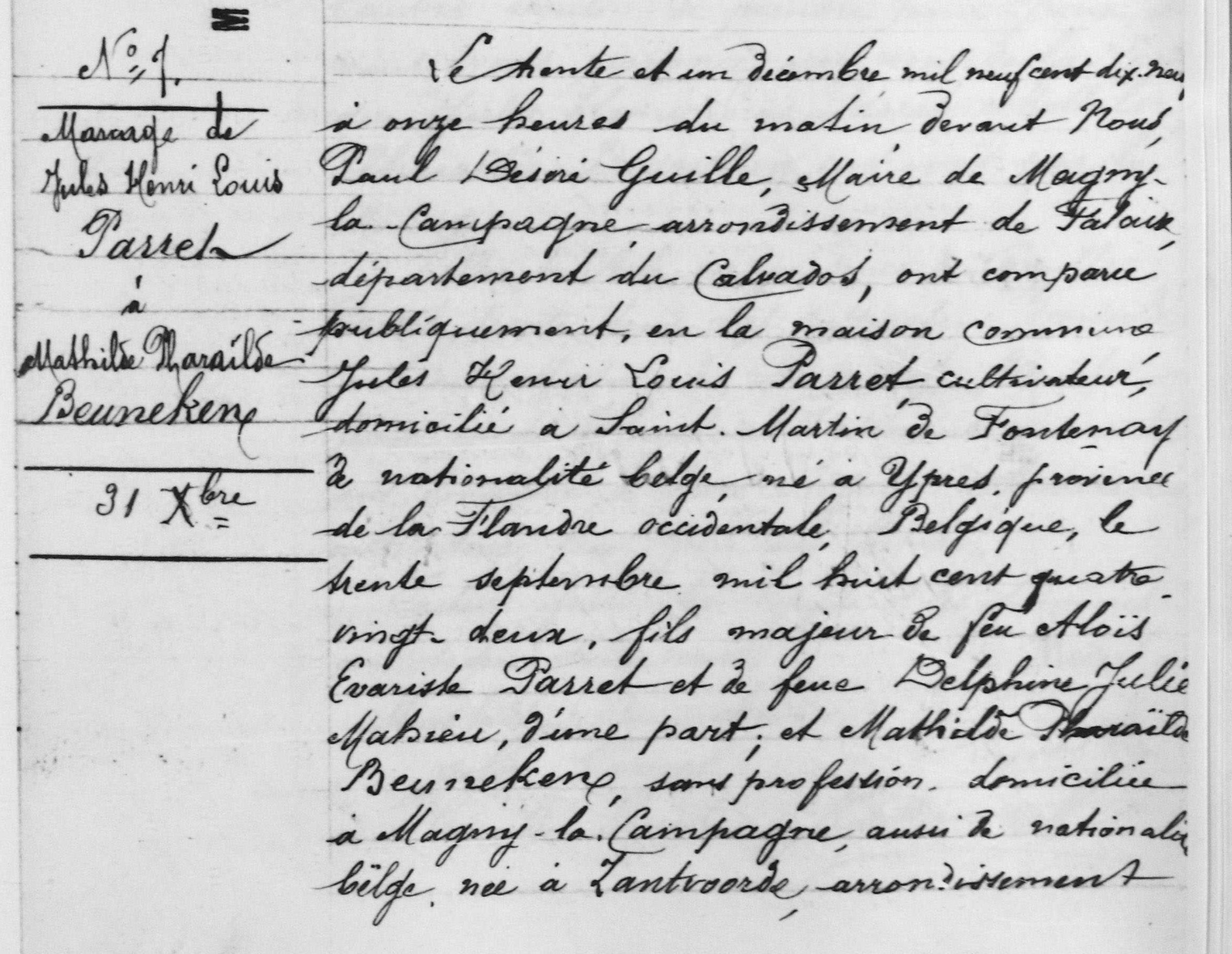 Beuneken Mathilde Pharaïlde huwt tijdens het verblijf in Frankrijk met Parret Jules Henri Louis (°Ieper 30/09/1882) op 31/12/1919 in Magny-la-Campagne