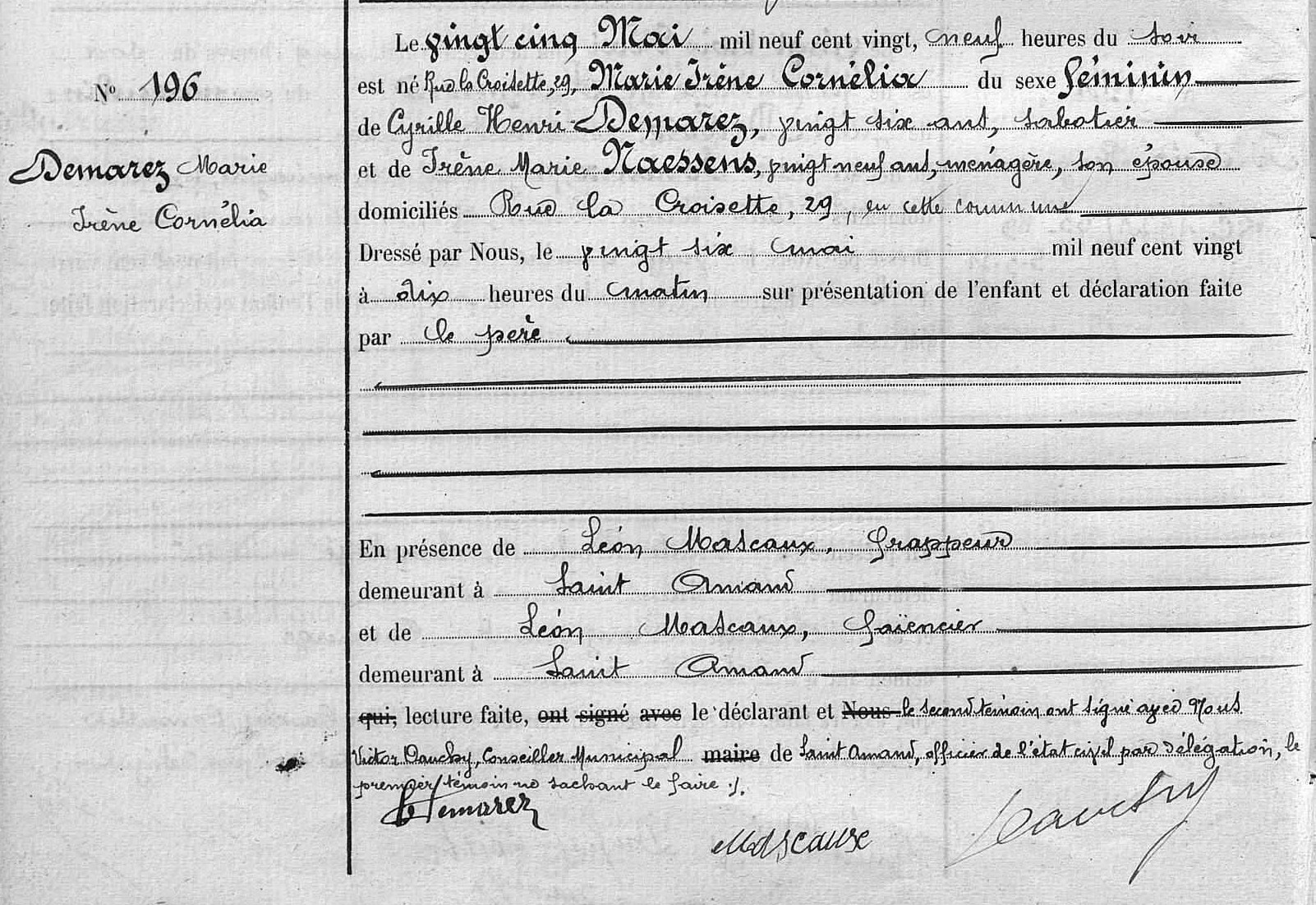 Dochter Demarez Marie Irène Cornelia werd tijdens hun verblijf in Frankrijk geboren op 25/05/1920 in Saint-Amands-les-Eaux