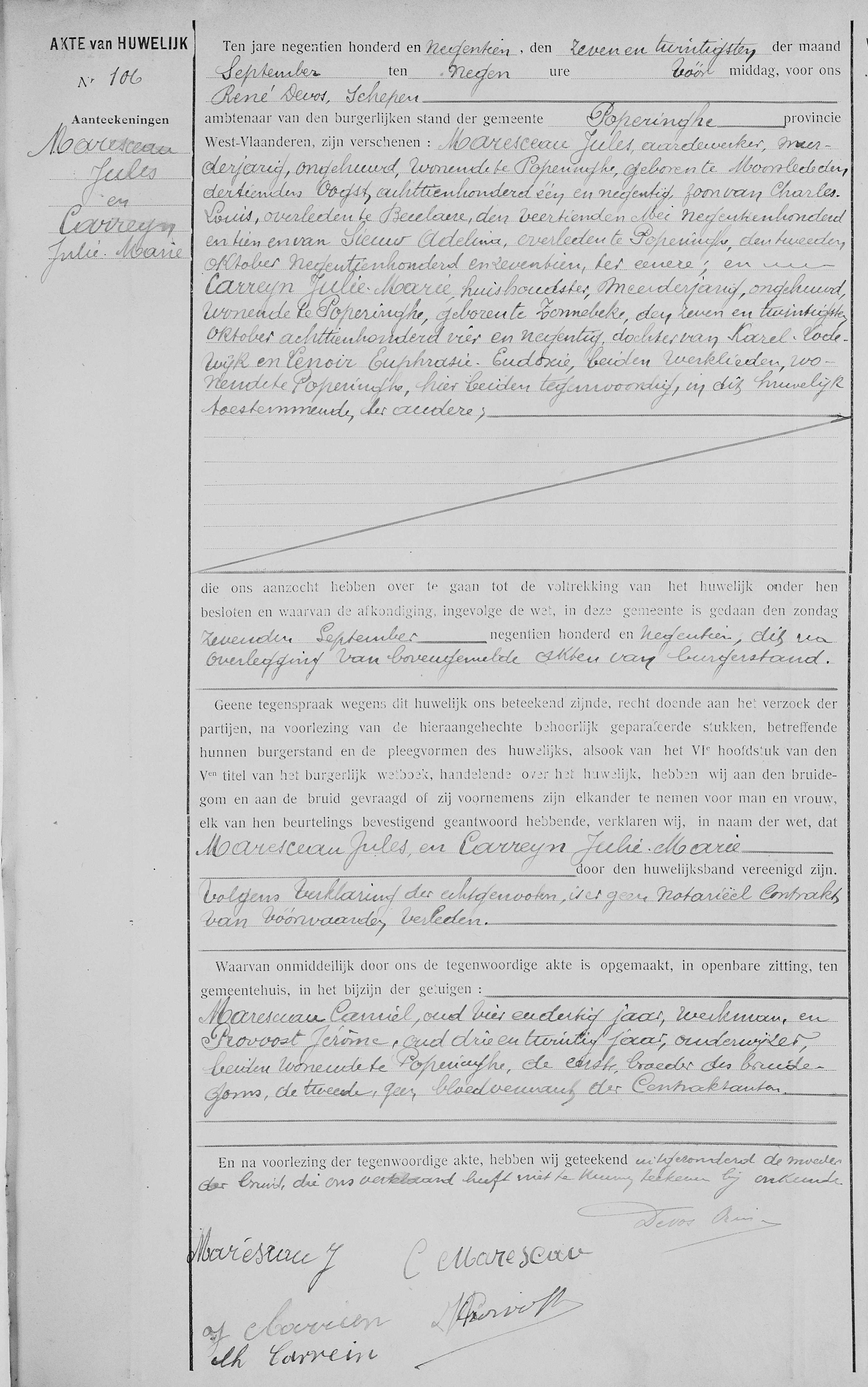 Maresceau Jules huwt tijdens het verblijf in Frankrijk met Carreyn Julie Marie (° Zonnebeke 27/10/1894) op 27/09/1919 in Poperinge