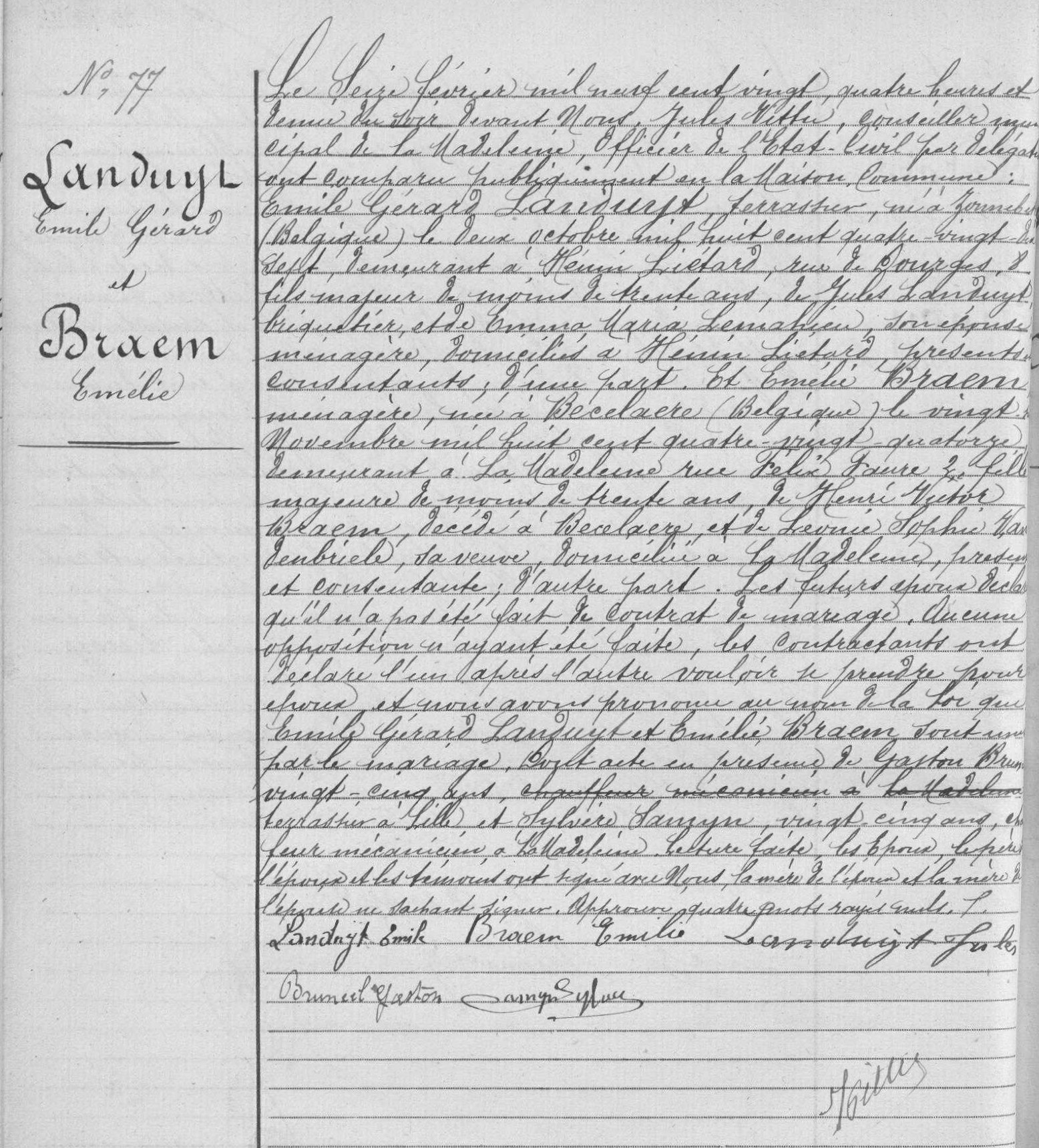 Braem Emelia huwt tijdens het verblijf in Frankrijk met Landuyt Emile Gerard (° Zonnebeke 2/10/1897) op 16/02/1920 in La Madeleine