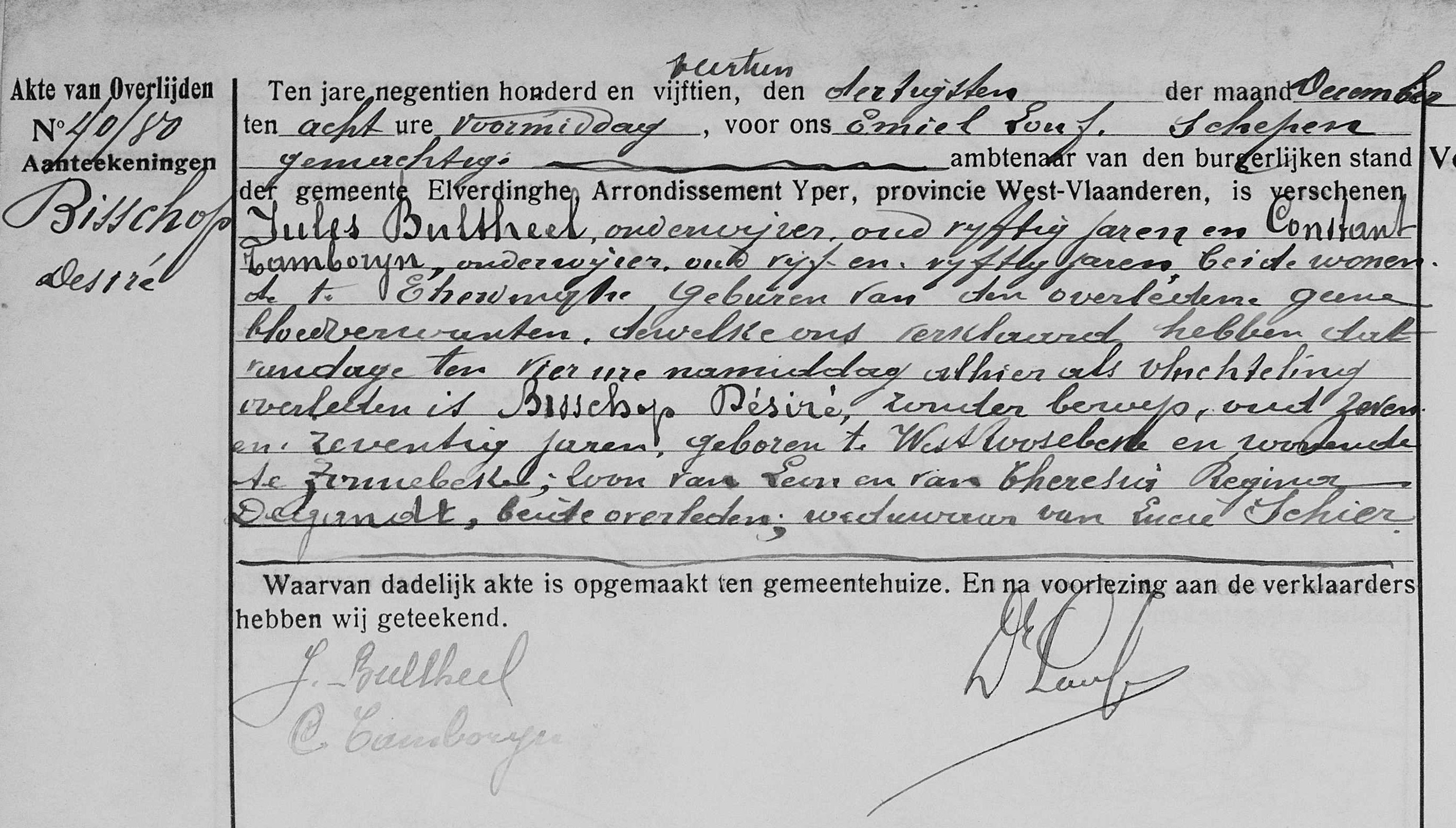 Bisschop Desiderius is tijdens de vlucht overleden op 30/12/1914 in Elverdinge