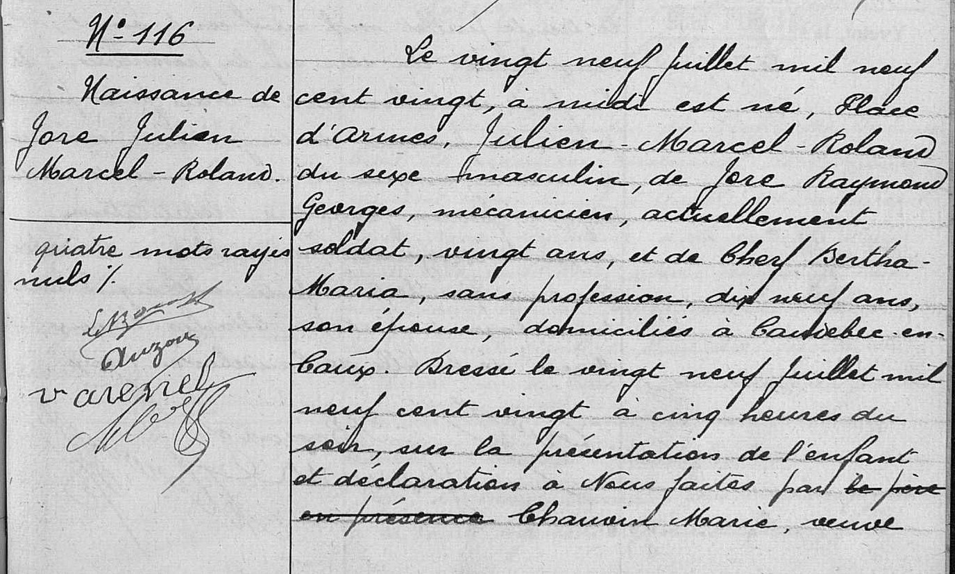 ↑ Geboorteakte van Jore Julien Marcel Roland deel 1↑