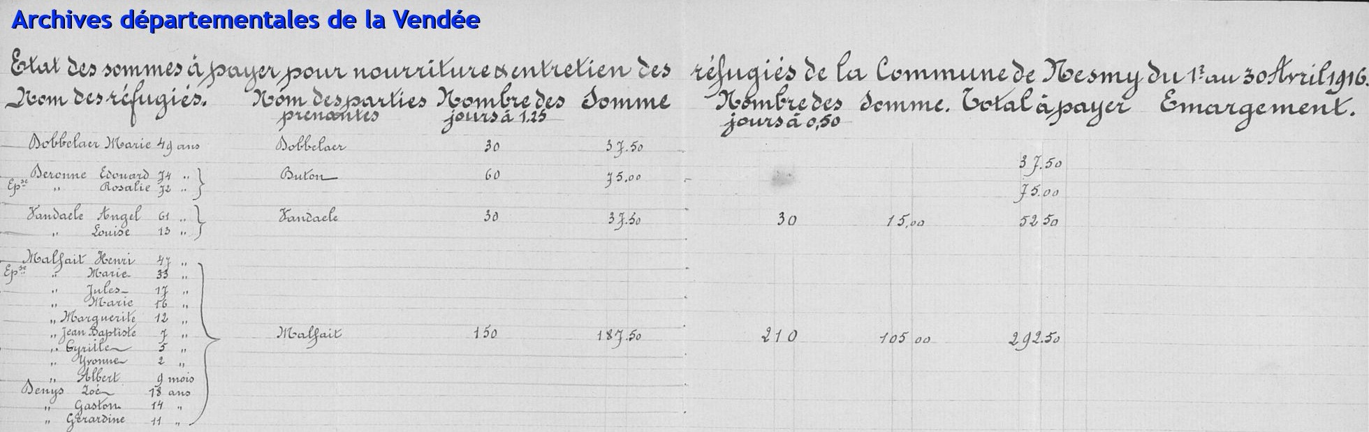 Hendrik Lodewijk Malfait was weduwnaar in eerste huwelijk van Emma Maria Verbeke († Geluveld 25/06/1904) en Maria Helena Everaerd was weduwe in eerste huwelijk van Theophile Emile Denys († Ieper 15/05/1906). Hendrik Lodewijk en Maria Helena Everaerd verbleven in Nesmy (Vendée) met Jules Cyrille (18j), Marie Madeleine (°1899), Margareta Julia (°1903) Everaerd, de kinderen uit zijn eerste huwelijk, met Jean Baptiste (°1908), Cyrille Marcel (°1910) en Yvonne Julie (°1913) Everaerd, de kinderen uit zijn tweede huwelijk en met Zoë (18j), Gaston Joseph (° 1901) en Gérardine Marie Denys (°1904), de kinderen uit het eerste huwelijk van Maria Helena Everaerd. Oorlogsvluchtelingen ontvingen een vergoeding voor voeding en onderhoud , het zogenaamd vluchtelingengeld, van 1,25 fr. per dag per volwassene of kind ouder dan 15 jaar en 0,50 fr. per dag per kind van 15 jaar of jonger. De familie Malfait-Everaerd ontving van de gemeente Nesmy voor de periode van 1 tot en met 30 april 1916 een bedrag van (30 x 5 x 1,50 fr.) + (30 x 7 x 0,50) = 292,50 fr. (Bron: ADV 10 R 38 - 8 Listes nominatives de réfugiés arrivés dans les communes de Mouilleron-en-Pareds à Palluau). In Nesmy werd op 3 juli 1915 hun zoon Albert Joseph Malfait geboren.