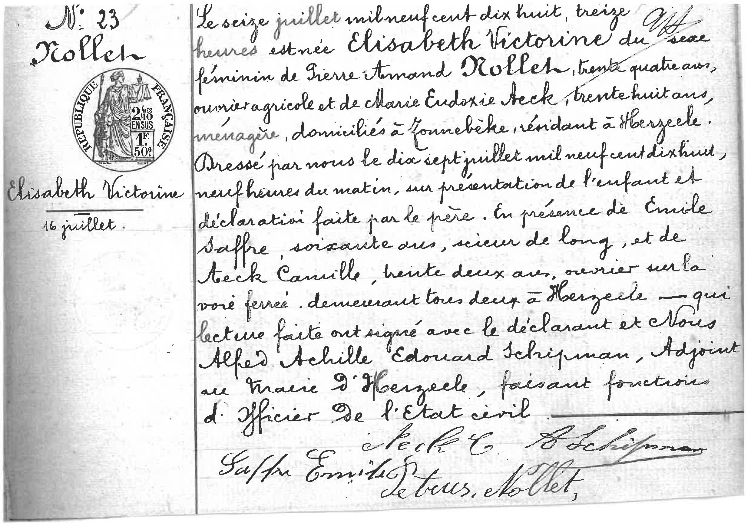 Dochter Nollet Elisabeth Victorine werd tijdens hun verblijf in Frankrijk geboren op 16/07/1918 in Herzeele